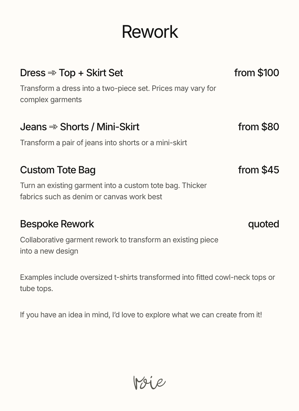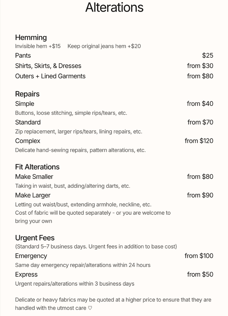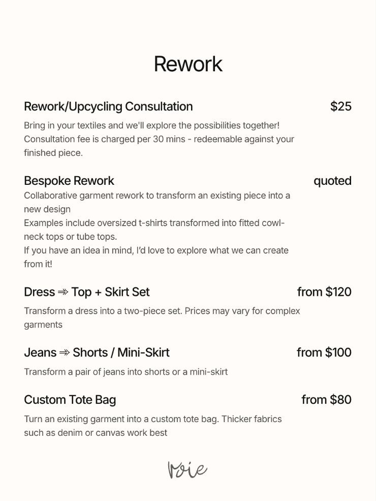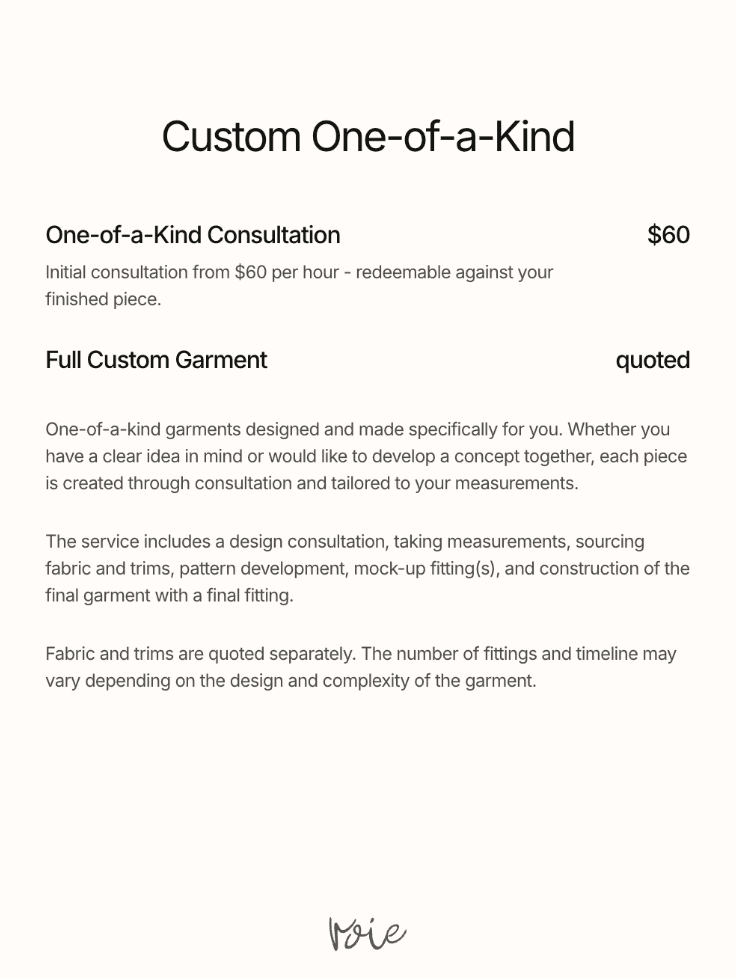 Whether you are hoping to extend the life of a beloved garment through alterations, rework an existing item into something new, or bring a piece you have imagined into reality, each project is approached with care and attention to detail.